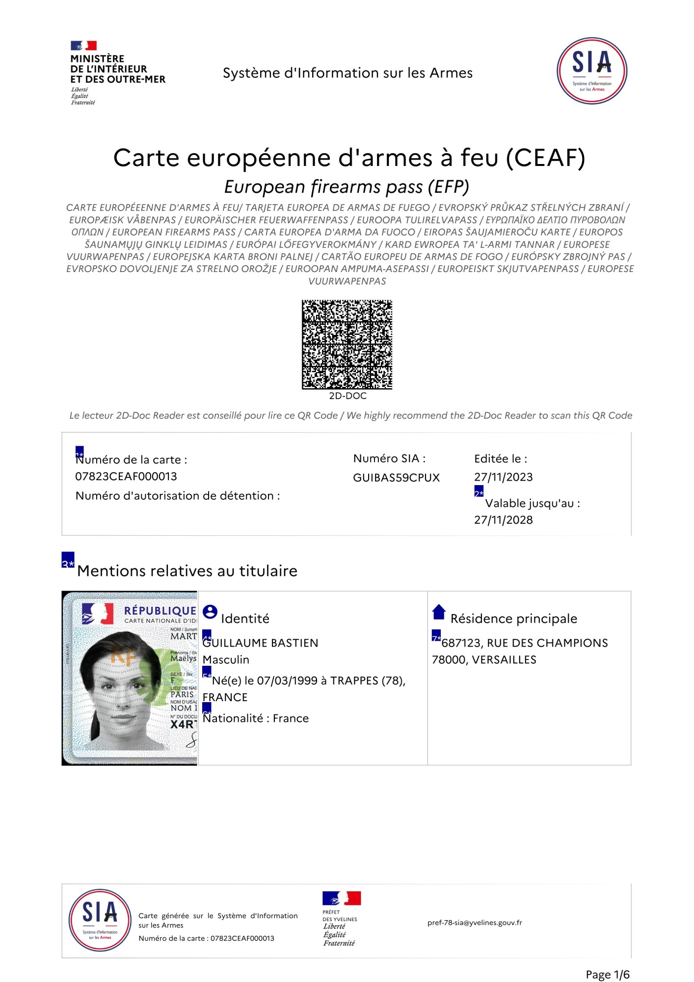 Vous devez présenter la carte européenne d'armes à feu et le justificatif à toutes demandes des autorités habilitées.